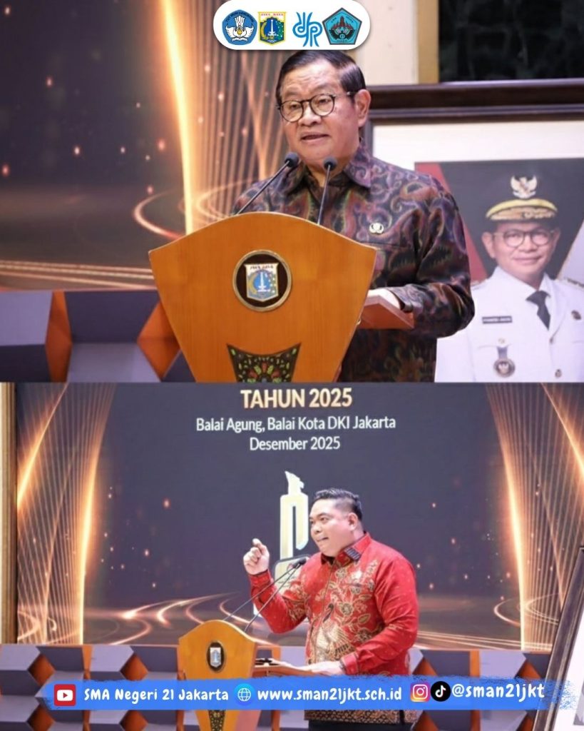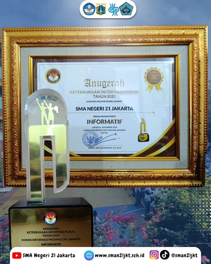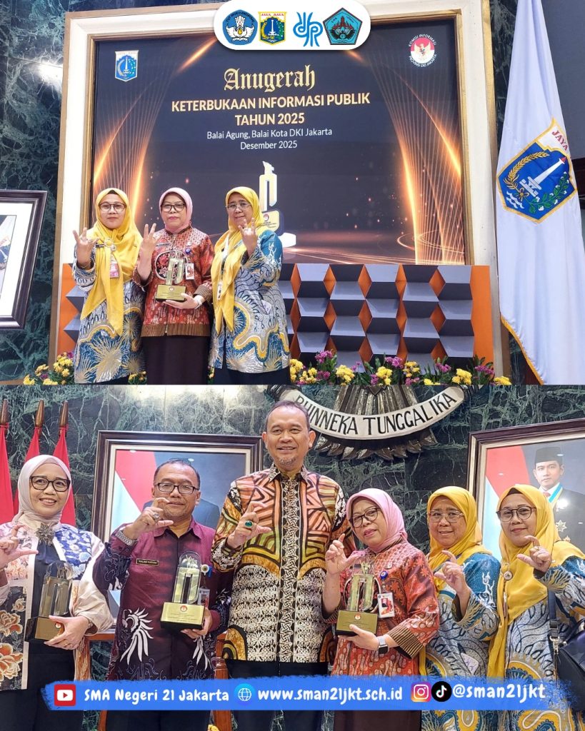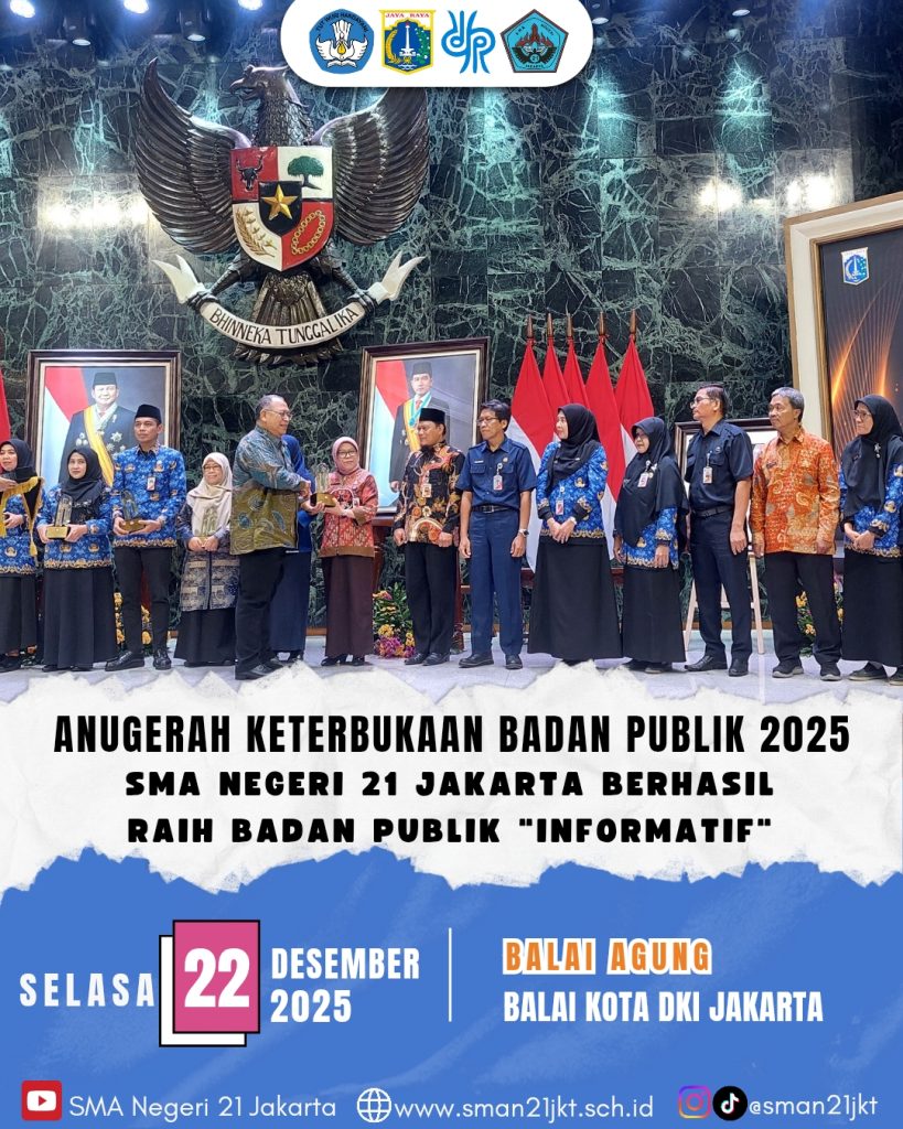 🏆 Penganugerahan Keterbukaan Informasi Badan Publik 2025Selasa, 22 Desember 2025, bertempat di Balai Agung, Balai Kota DKI Jakarta, telah diselenggarakan Penganugerahan Keterbukaan Badan Publik Tahun 2025 oleh Komisi Informasi DKI Jakarta.Dengan penuh rasa syukur dan bangga, SMA Negeri 21 Jakarta berhasil meraih predikat Badan Publik Informatif Tahun 2025, penghargaan yang diberikan langsung oleh KI DKI Jakarta sebagai bentuk komitmen terhadap keterbukaan informasi publik.